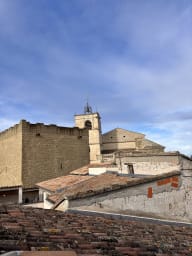 Une terrasse accessible depuis le séjour permet de profiter d’un coin repas pour deux personnes, avec une vue dégagée sur les toits et le clocher de l’église.