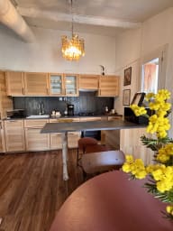 La cuisine ouverte est équipée d’un four, de plaques de cuisson au gaz, d’une hotte, d’un réfrigérateur, d’un lave-vaisselle, d’un micro-ondes, d’une cafetière à filtre et d’une bouilloire.